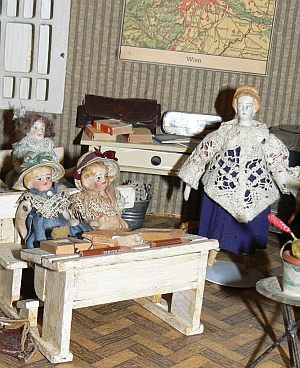 ![]() A close-up of the school room. Detail aus der Puppenschule. |