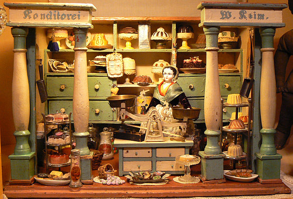 Puppenläden gab es in unterschiedlichster Form: "Tante-Emma"-Läden, Konditoreien, Bekleidungsgeschäfte, Fleischereien, ...
