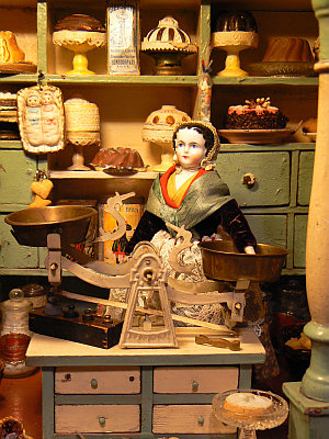 Pastry shop about 1820, produced by the Nuremberg company Georg Hieronimus Bestelmeier. The Biedermeier-saleslady offers a wide variety of fancy cakes, pies and sweets. The two cake posts were manufactured by the Märklin company. Measures: 48 cm wide, 30 cm deep, 32 cm high. Konditorei ca. 1820 produziert von der Nürnberger Firma Georg Hieroniums Bestelmeier. Die Biedermeier-Verkäuferin hält Torten, Kuchen und Süßwaren in reicher Auswahl feil. Bei den beiden Tortenständern im Vordergrund handelt es sich um Produkte der Firma Märklin. Maße: 48 cm breit, 30 cm tief, 32 cm hoch. |