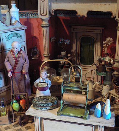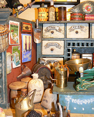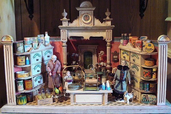 General store about 1900/10, produced by the company Moritz Gottschalk, Marienberg/Erzgebirge, Germany. The shop's furnishing, wares, saleslady and customer with pram are also from this period. Measures: 46 cm wide, 20 cm deep, 22 cm high. Gemischtwarenladen um 1900/10, Hersteller Firma Moritz Gottschalk aus Marienberg/Erzgebirge. Die Ladeneinrichtung samt Ware sowie Verkäuferin und Kundin mit Kinderwagen ist ebenfalls diesem Zeitraum zuzuordnen. Maße: 46 cm breit, 20 cm tief, 22 cm hoch. |