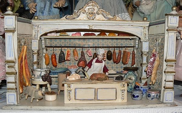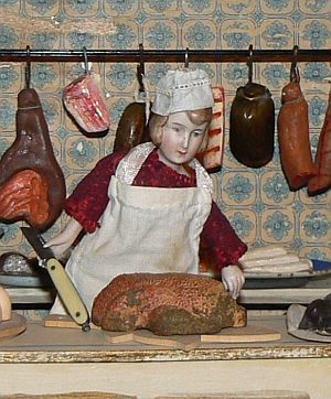 This is a butcher's shop from the Gottschalk company. It was produced about 1870-1880. The housing, the wall papers and the chattels are original. The meat and sausages are newer but old, too. The plate scale (correct term?) in the background was made about 1900 and is decorated with a Holland motive (rare). The saleslady has a bisque head and was produced about 1920. The butcher's shop measures: 49 cm wide, 24 cm deep, 32 cm high. Dies ist eine Metzgerei der Firma Gottschalk. Sie wurde um 1870-80 hergestellt. Das Gehäuse, die Tapeten und das Mobiliar sind original. Die Fleisch und Wurstwaren wurden später hergestellt, sind aber ebenfalls alt. Die Tellerwage im Hintergrund wurde um 1900 hergestellt und ist mit einem Holland-Motiv (selten) verziert. Die Verkäuferin hat einen Biskuit-Porzellankopf und wurde um 1920 hergestellt. Die Metzgerei ist 49 cm breit, 24 cm tief und 32 cm hoch. |