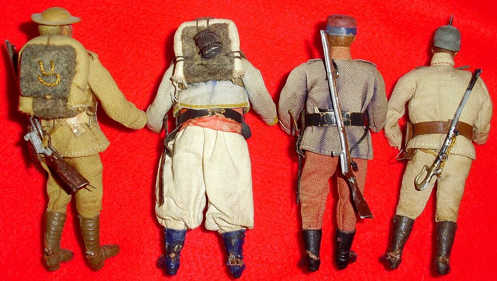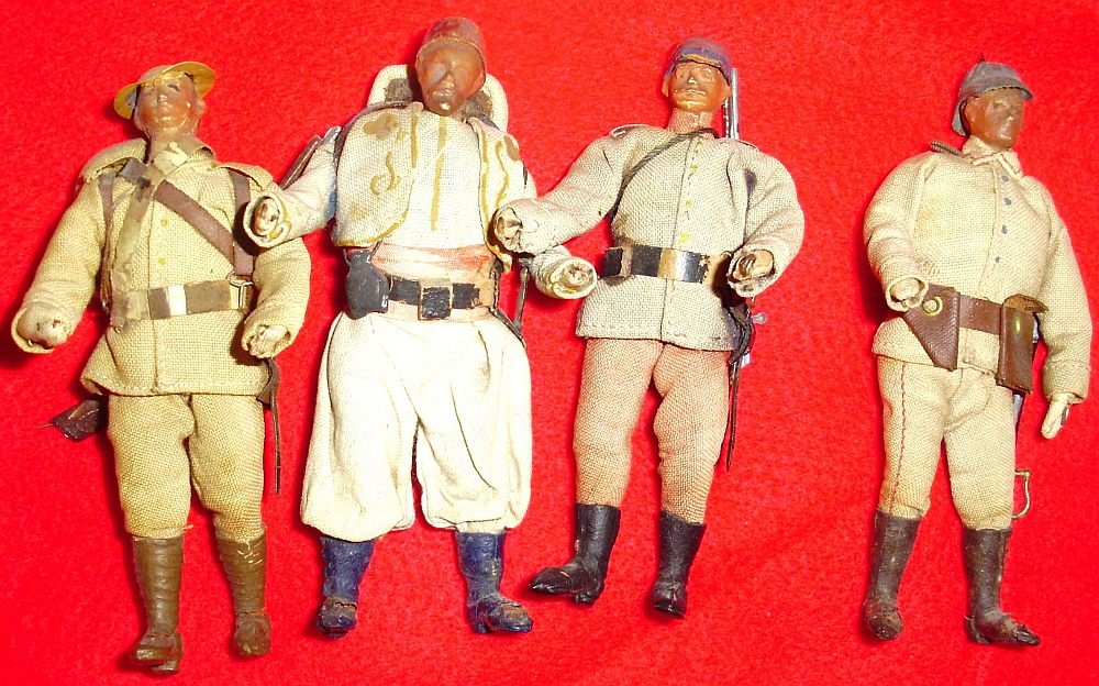 "Posable Soldiers": 1914-1918 "Bewegliche Soldaten": Diese Soldaten sind ca. 11 cm groß und wurden von 1914-1918 hergestellt. Sie sind sehr selten. Es gibt noch mehr Ausführungen als die unten Gezeigten. Die Konstruktion besteht aus einem biegbaren und skelettartigen Drahtgestell, das mit Stoff und Faden umwickelt wurde. Die filigranen gearbeiteten Soldaten wurden mit einer Vielzal von Zubehörteilen ausgestattet. Sie konnten Objekt in ihren Drahthänden halten.
