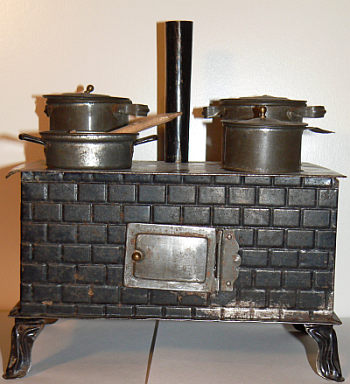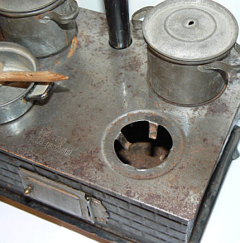 This toy stove was made in Germany, probably in the 1920s. The top of the stove pipe is missing. The stove was spirit fired and could actually be used to cook small meals.Dieser Spielzeugherd stammt aus Deutschland. Wahrscheinlich wurde er in den 1920ern hergestellt. Der Herd konnte richtig befeuert werden, um so kleine Mahlzeiten zu kochen. Am Ofenrohr fehlt die Spitze, Krone genannt.