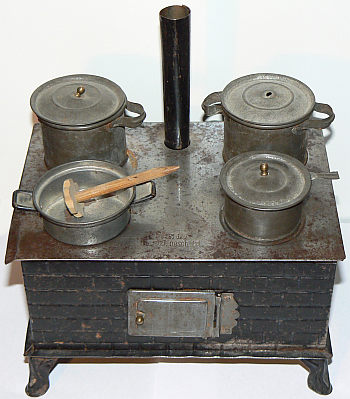 Here we collect accounts about toys made of metal. There have been all kinds of metal toys: cars, trains, Zeppelins, stoves, kitchen equipment, animals and even dolls. We start with a toy stove and a train.
