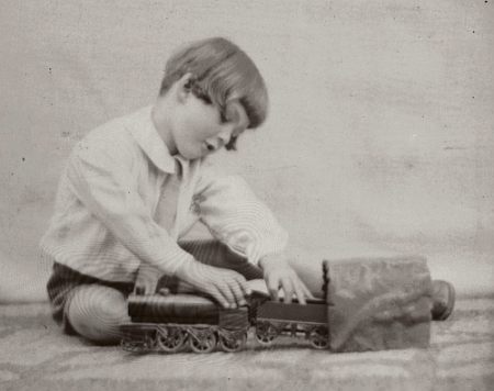 Hier spielt ein junger Engländer (ca. 5 Jahre alt) mit seinem Spielzeugzug in den 1920ern. Dieses Zug-Set war sicherlich ein wundervolles Spielzeug für sein Alter. Züge waren groß, kraftvoll und laut und haben bestimmt jeden Jungen fasziniert. Preiswert war dieses Set sicher nicht und daher war solch ein Spielzeug den oberen Schichten vorbehalten.