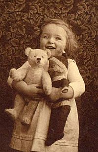 A little girl with her Steiff-teddy and a cloth doll about 1925 (teddy from about 1915). Ein kleines Mädchen mit ihrem Steiff-Teddy und einer Stoff-Puppe um 1925 (Teddy um 1915). |