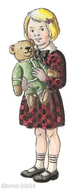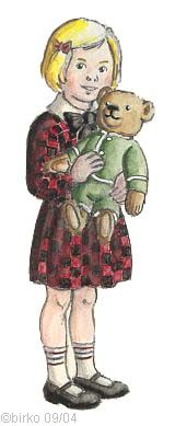 Shortly after Charlotte's 80th birthday she passed away and is deeply missed. Almost 79 years Teddy was a dear companion for Charlotte. Some years before her death Charlotte decided where Teddy should remain when she would not be able to care for him any longer. Her wish has been fulfilled. We are very thankful, that we knew Charlotte and could be her friends. There is a little anecdote which can show how deeply Charlotte loved her teddies: Charlotte loved to decorate her bears with cheap costume jewelry and other things. So we were not surprised to find the teddies with lots of glitter. We found it only strange to find Charlotte's credit card under one bear. We brought the teddies to their new home. There after a closer look we were really astounded. The bears were equipped with very good and expensive jewelry! The teddies were Charlotte's jewelry case. Now the teddies live again with only fashion jewelry. The real jewelry of course has retourned to the right and new owner.(The drawing on this page was inspired by photos of Charlotte in her childhood days.)