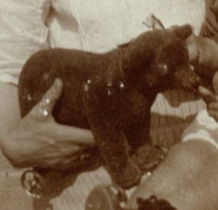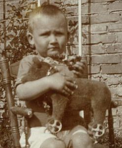 This little boy and his bear on wheels were photographed in 1913. The bear was probably produced by the Steiff company. There is a chain attached the the bear to pull it along. Dieser kleine Junge und sein Räder-Bär wurden 1913 fotografiert. Der Bär wurde wahrscheinlich von der Firma Steiff hergestellt. Mit einer Kette konnte der Junge den Bären mit sich ziehen. |